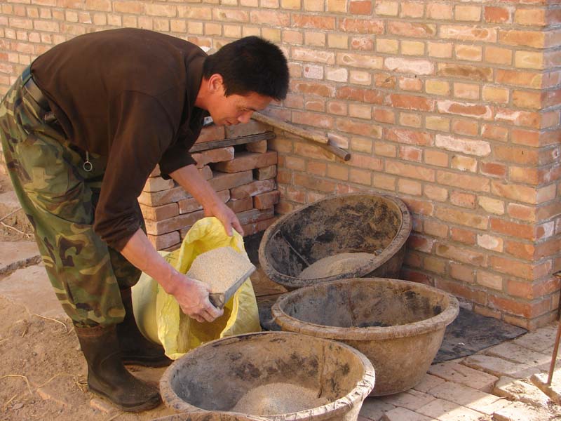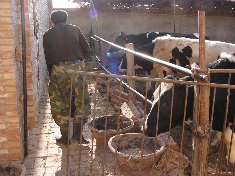 鲁迅先生说奶牛这种动物吃的是草却挤出来的是奶,但这种说法现在似乎有点过时了,奶牛要用专门的饲料去喂养才行。男主人正给奶牛往这几个被舔得很干净的大皮盆里盛饲料呢,老师和他问了许多关于奶牛方面的技术问题,我也旁听了一下,还学到了不少东西呢。他一边和老师说话,一边加料,沉稳熟练的动作都说明他是个饲养高手了。