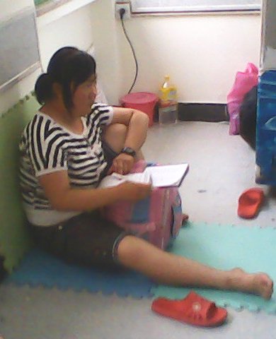 在医院中,我边做检查,边完成老师布置的作业。没有好的学习环境,我只能凑合着来了:有时坐在楼梯上,趴在腿上写,有时也会把书包当成桌子,坐在地下,趴到书包上写。医院中的医生、护士、以及病人家属都伸出大拇指,说我是个懂事、爱学习的好学生。
