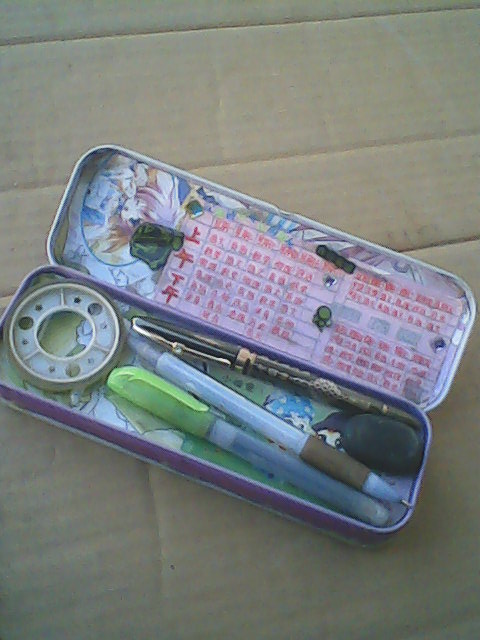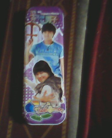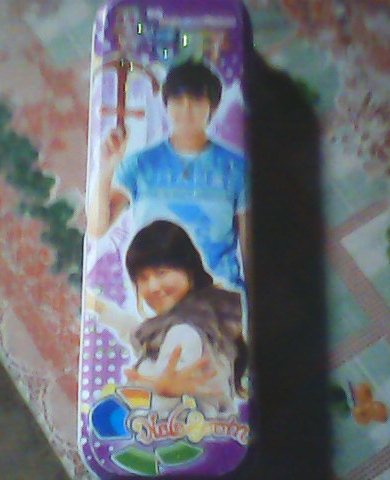 文具盒的上面画着一位美女和一位帅哥,他们大概是影视明星吧,但是我不认识。图案的上面有一层小亮点,若是在灯光下看,好像是许多耀眼的小星星。