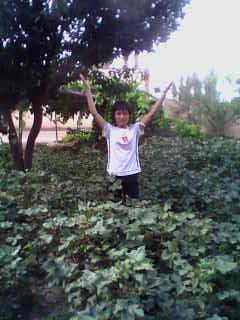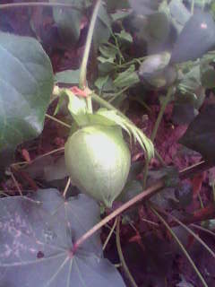 我站在田间的小路上,眺望远处,棉花上已经结满了花骨朵,那些花骨朵儿周围圆圆的,上面尖尖的,好像个桃子。