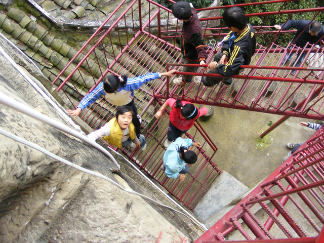 到了大木山入口,这里有个标志牌。顺着这个入口下去,是一条羊肠小道,不太宽,大约不到一米的样子。走了一会儿,便看见路旁的石岩上有许多的字画,而且往前走,越来越多。这些字有的端端正正,有的歪歪斜斜,有的我认识,更多的是我不认识的。大约过了50多分钟,我们便来到了大木山上的观音洞。观音洞位于大木山半山腰上,通向洞内的是许多的云梯。从上向下看,还真有点居高临下的感觉的呢。参观完观音洞,我们便草草地吃了午饭,然后听袁家祥老爷爷给我们讲故事……