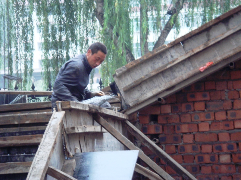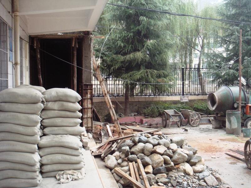 这是厕所的前门,也是男生厕所的入口处。原来这里是一个小花园,里面有一个葡萄架。门前堆放了好多水泥和石料。