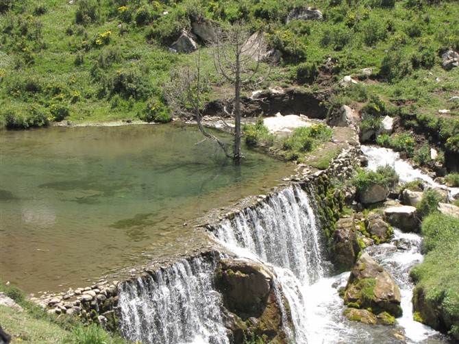 在那儿,山高水低。水却仅仅具有柔之美,它像舞者的裙摆,飘落萦绕在山脚下,水流从高处的泉眼股股流向山脚,给了这山以一种雄浑,飘柔之美。
