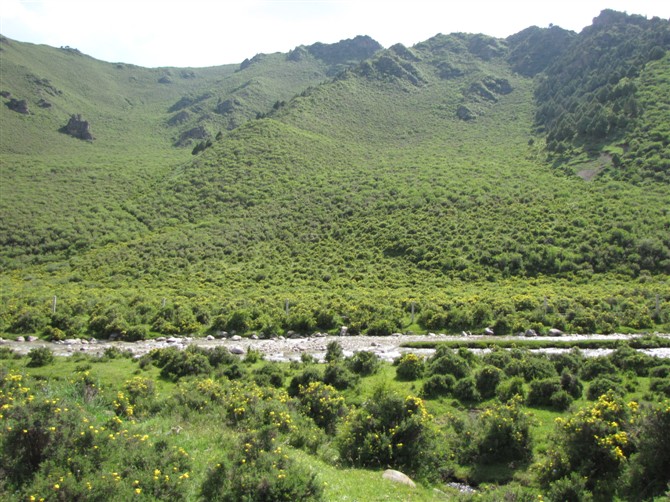 先不说它们的长相,先来看看它们生活的地方吧!在那儿,群山萦绕,芳草碧连天。远远望去,仿佛是从天际蜿蜒而下的一卷绿色地毯,而这像绿色地毯般肥沃的草场,正是牦牛们得仙境。