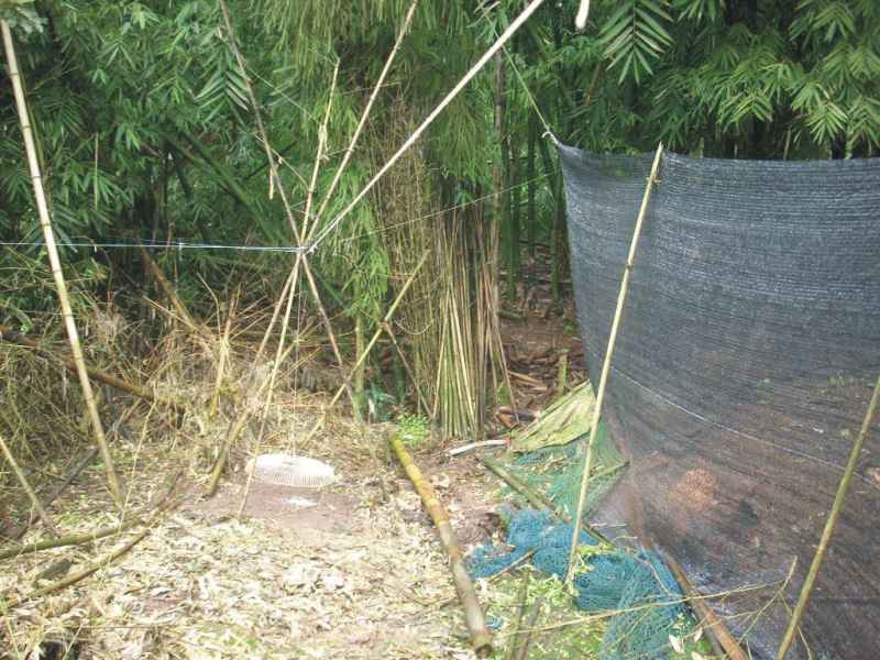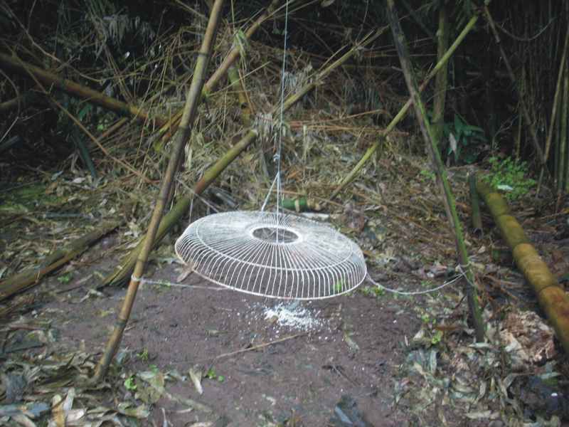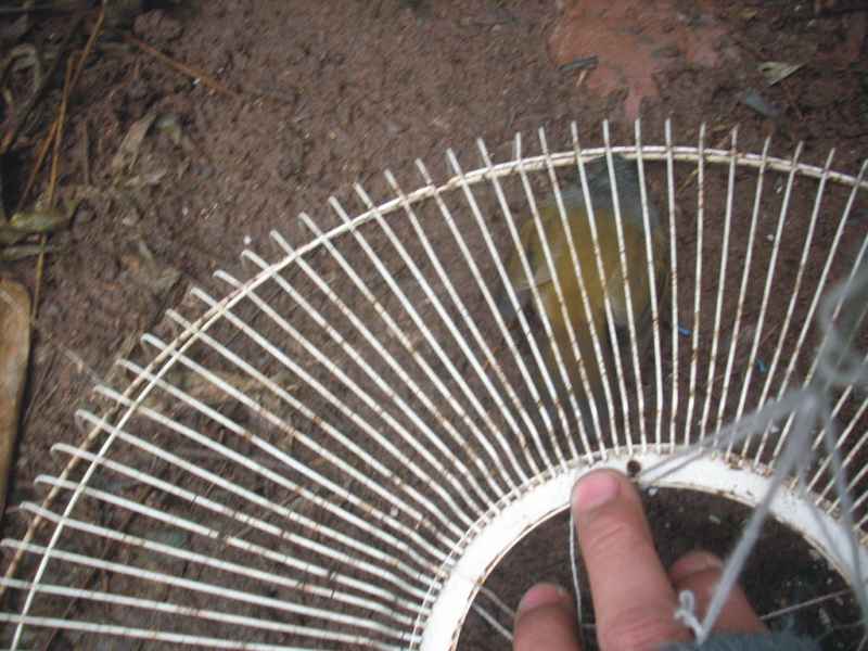 这天,当我路过一户人家时,见他家屋外横七竖八拉着一些线,仔细一看一根长线绑在了柱头上,一端吊着一个电风扇叶的罩子,悬在空中,下面还放着些碎米,我便知道那是用来捕鸟的。