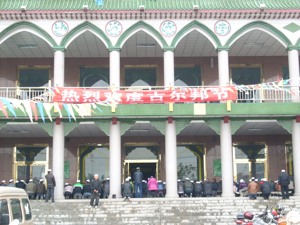 我们宁夏是回族聚集的地区,每当到古尔邦节,清真寺被打扫得干干净净,挂上"热烈欢度古尔邦节"等标语,以示庆贺。