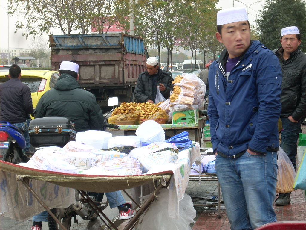 这一天,清真寺前,车水马龙,有些回族人开着自己的小轿车来上寺,还有的回族人骑着摩托车、电动车来上寺,小本生意人在清真寺前摆摊设点,出售自己批发来的回回帽、盖头、麻花、馓子。