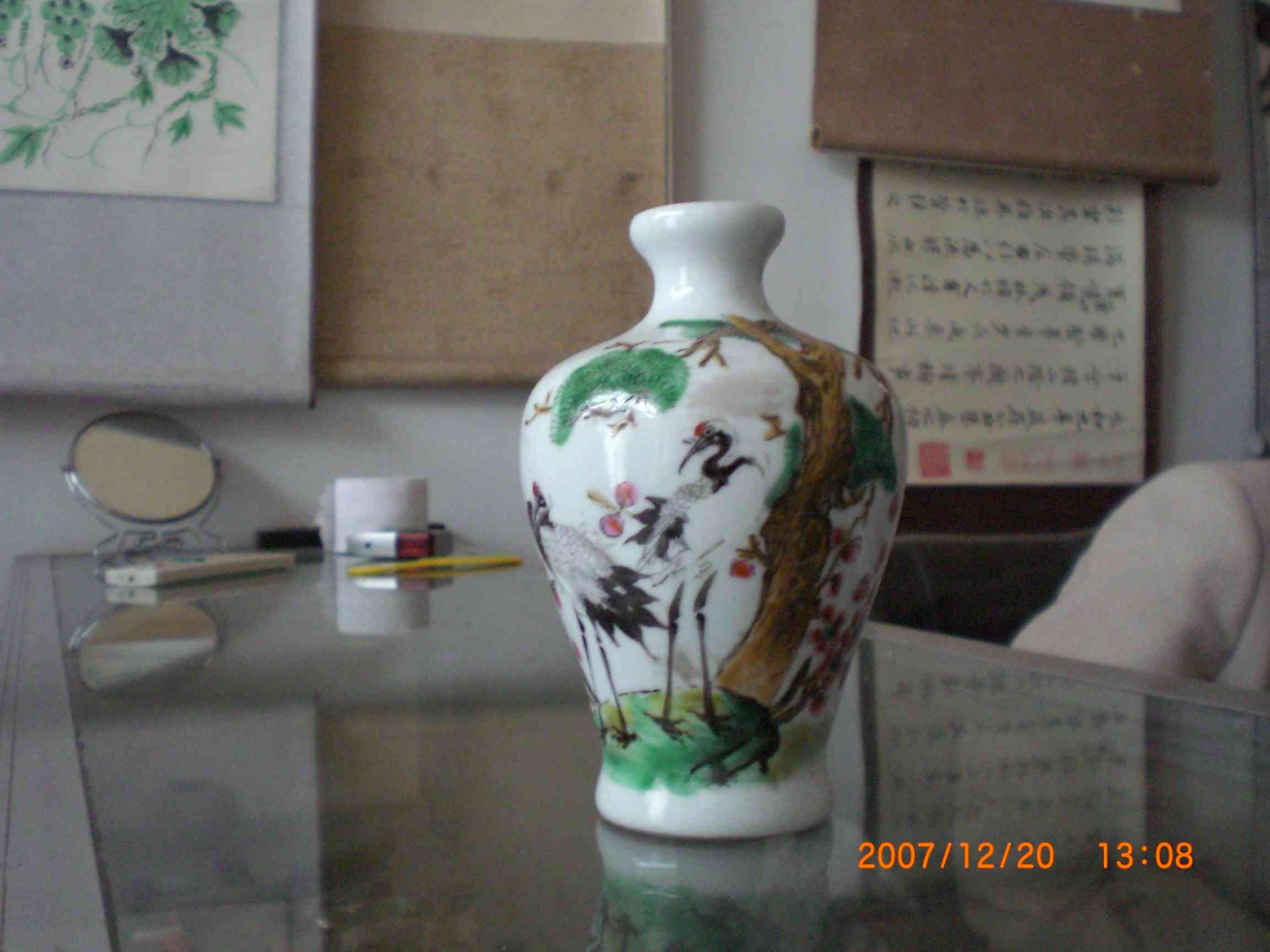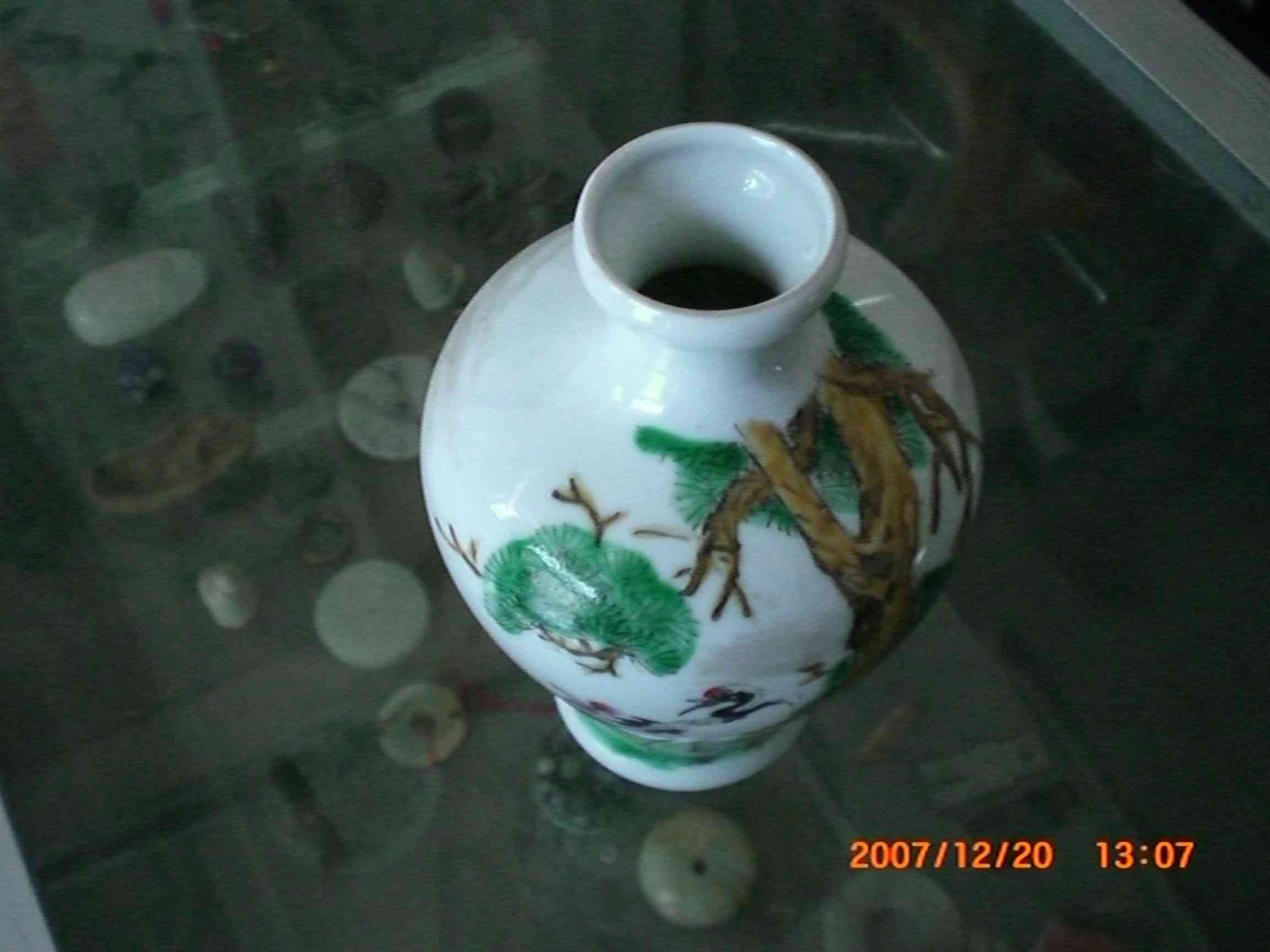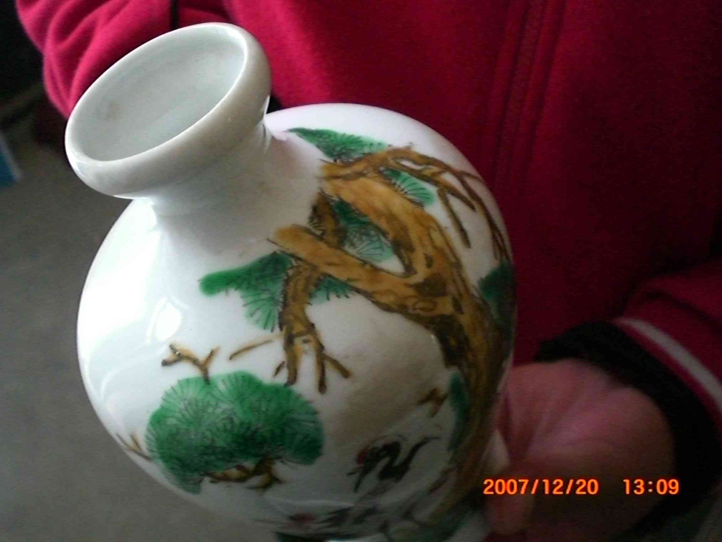 在客松的右上角还刻印着"松鹤延年"四个字,为这只梅瓶有增添了一道亮丽的风景。看似平常的梅瓶却成了祖上传下来的稀物。我真希望能永远传下去。