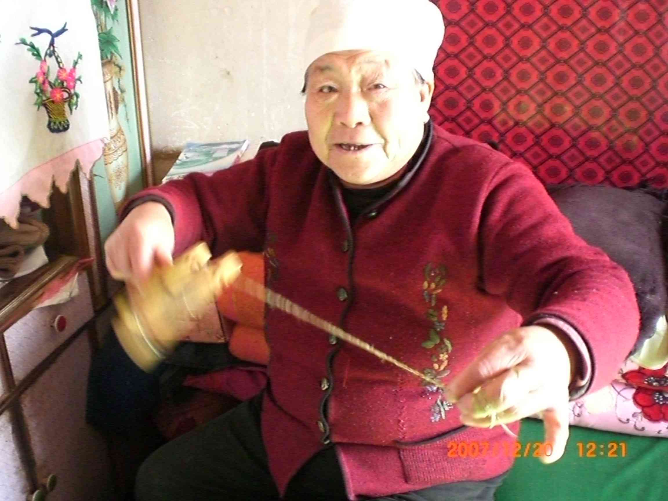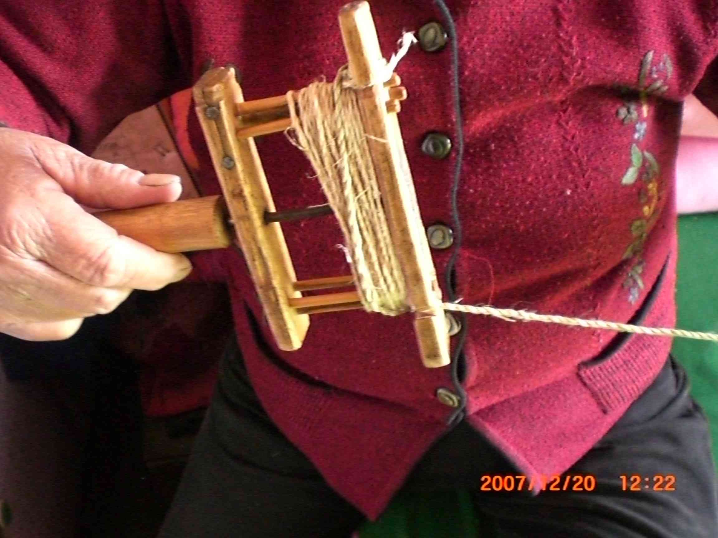 奶奶用拧车拧绳的时候就将线头撺进卡口里,手抓在拧车柄上,转动180度,车头就会绕车轴转180度,这样单线就拧成双线,再由线杆合并而成,这样,绳子就拧成了。