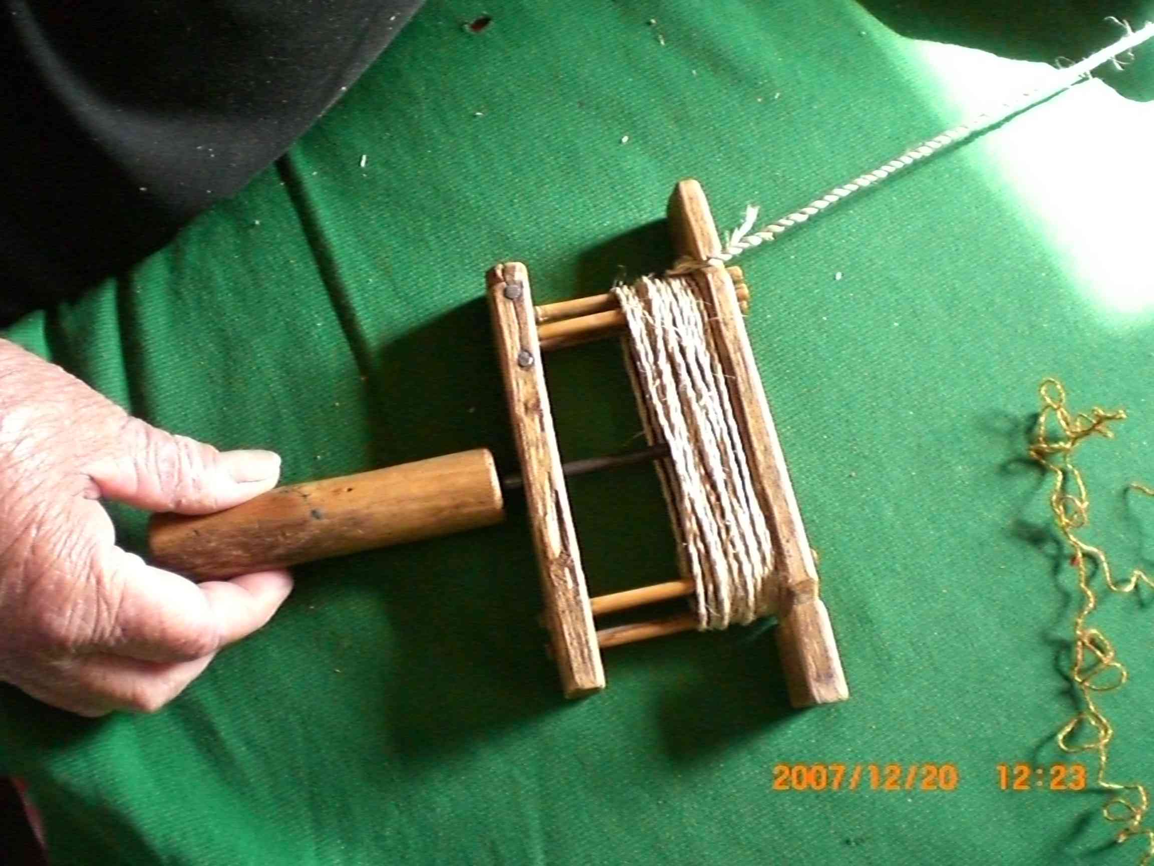 我所说的这个拧车结构非常简单,从整体来说是由拧车柄和车轴及车头组成。车柄长约9.5厘米。柄的直径约为2厘米,再柄的末端镶有长约8厘米的铁钉做为车轴,在车轴上有两个平行的木条,宽都为2厘米,靠铁钉的木条长为15厘米,靠柄的末端的木条长为12厘米,在着两个木条中间的两端各有6厘米细竹竿,可将两根木条连接起来,其实更大的作用是用来缠线的。在长木条的两端各有两个卡口。