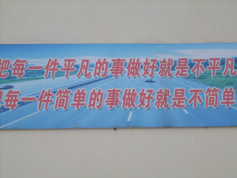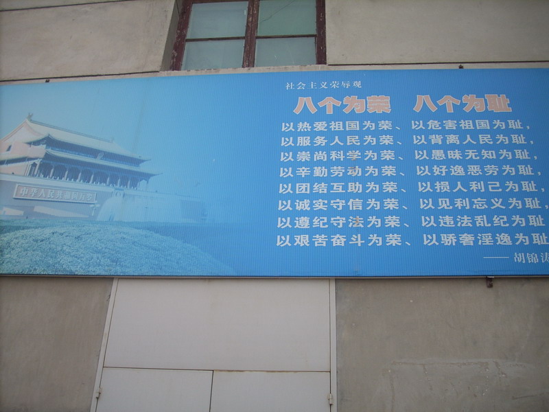 进入校园内,会看到第一块大标语,就是胡锦涛总书记的"八荣八耻",这个标语旗帜鲜明地告诉我们中学生什么应该做,什么不应该做.是我们的行为准则.对我们的教育意义很深刻.还记得这幅标语刚做出来的时候,老师让我们熟记下来,同时还进行了一次以"八荣八耻"为主体的演讲比赛.同学们做了很精彩的演讲.