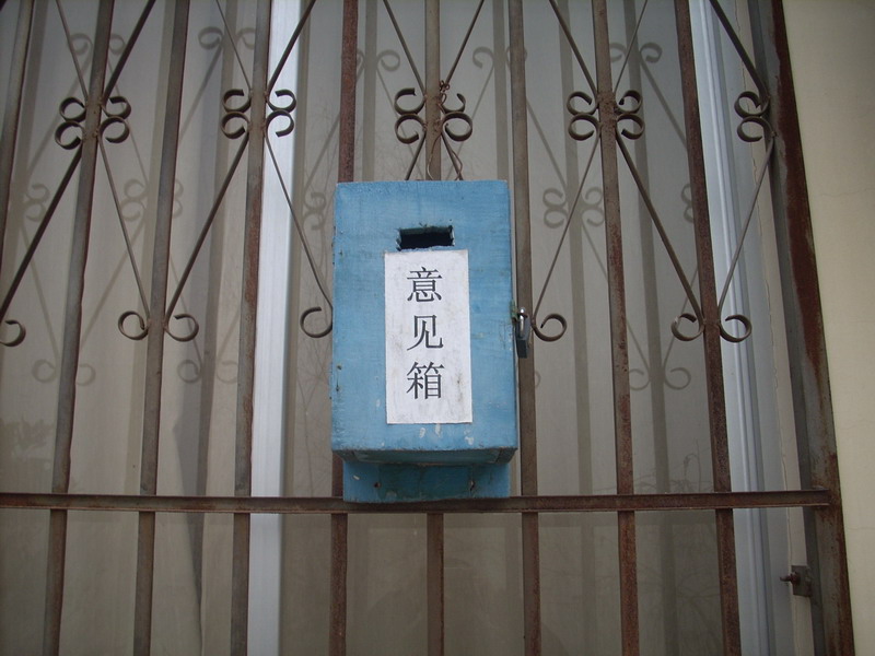 在校长办公室的窗子上有一个意见箱 ,当老师或者学生对学校的工作有什么建议或意见的时候,如果你不方便直接说出,就可以以书面的形式写出,投递到这个意见箱中,校长每周都要打开一次,了解老师和学生反映的情况.并做出及时的答复.