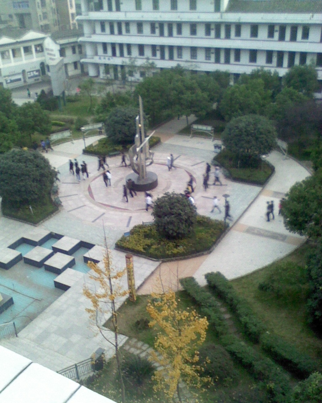 在教学楼前面是中心广场,那里有学校的标志,是寓意学校托起学生的希望与未来。