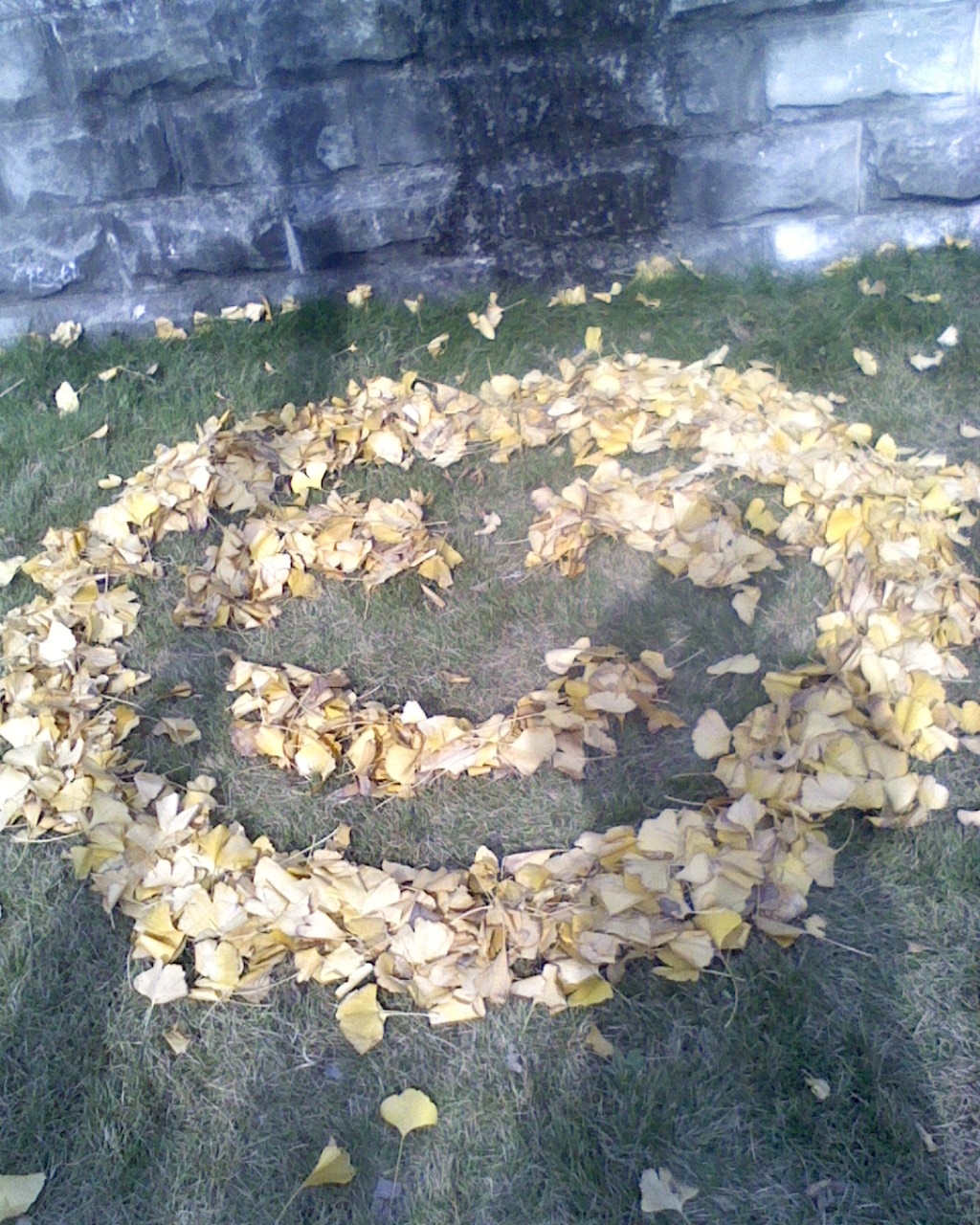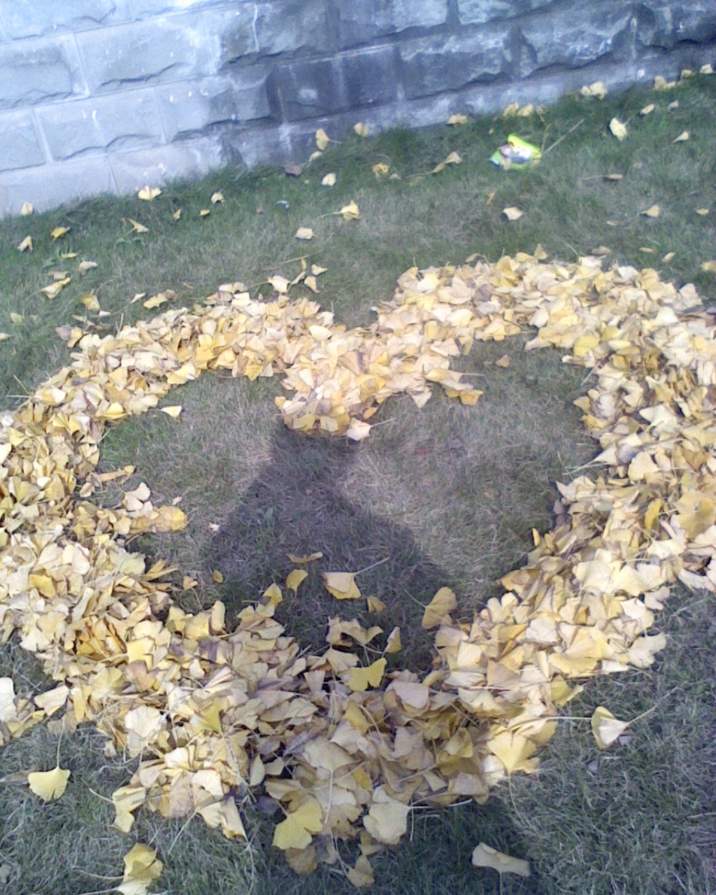 我们学校的学生是很有创造天赋的,有一天我看见几个学生在一棵树下把落叶堆成了一个桃心,以表达对学校的爱慕之情。
