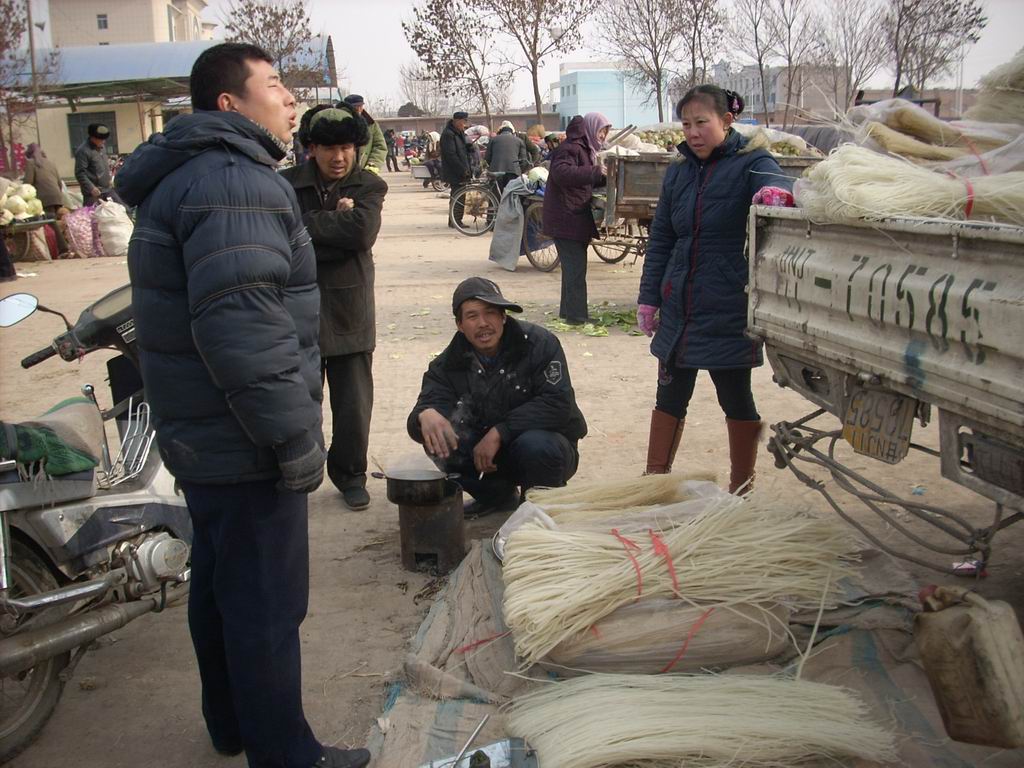 看这个烤火的带着帽子的人就是这车粉条的主人,天气很冷,烧上火炉,暖和一下,旁边不是有人来询问价格,也有一些人买走一点。