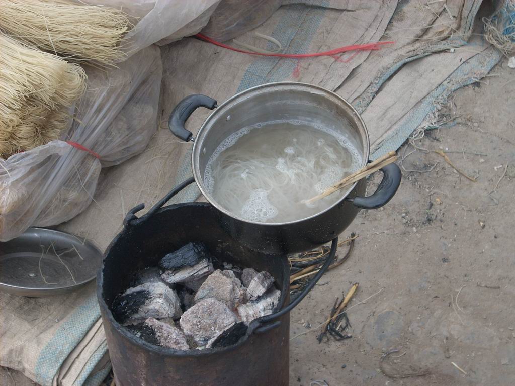 为了能够证明粉条的只质量,还专门拿着一个小锅锅,加上一点水,将水煮沸,放一把折断了的粉条,如果来得人不信,可以看锅里面煮的粉条再下决心买还是不买。