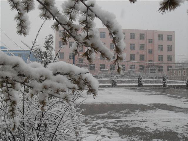 整个大地白茫茫的一片,校园里一片宁静,沉甸甸的积雪挂满枝头,都压弯了腰。网球场水泥地上的雪开始融化了。