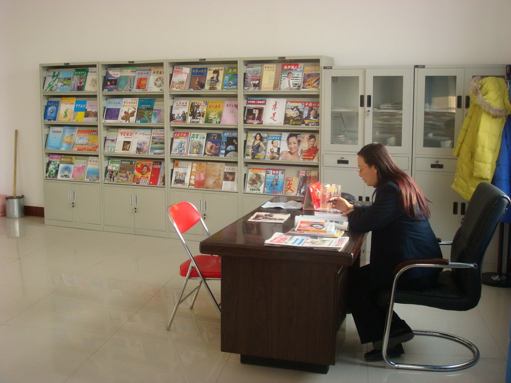 这是我们的阅览室管理员康玉琴老师,康老师说阅览室拥有各类学习用书、杂志108种,各类报纸近20种,特别能够满足全校师生员工教学和业余文化生活的需要。看,康老师和她的杂志陈列柜挨的多近啊!每天她都要认认真真的挨着检查报刊杂志是否完好 无损,是否有序摆放。