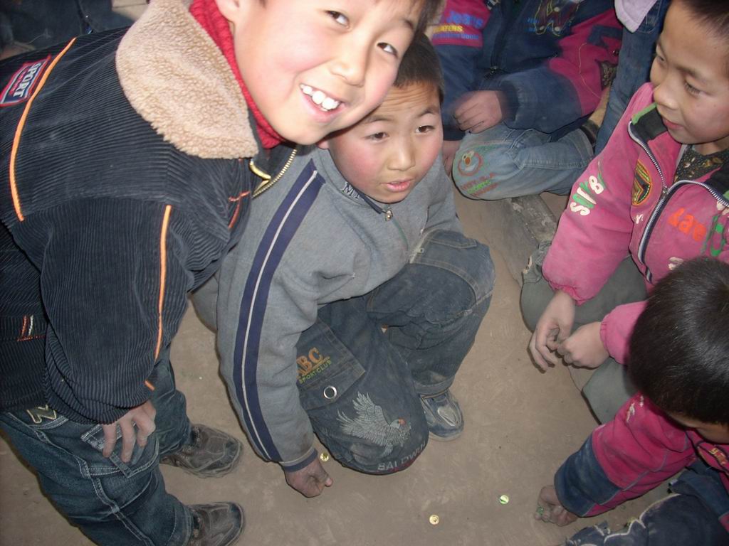在校园的另一角,调皮的小男生在玩弹珠子,地上出现的小坑,是他们展现自己高超技术的平台,他们随意的坐着,尽情的玩着,快乐的心情从他们脸上流露出来。