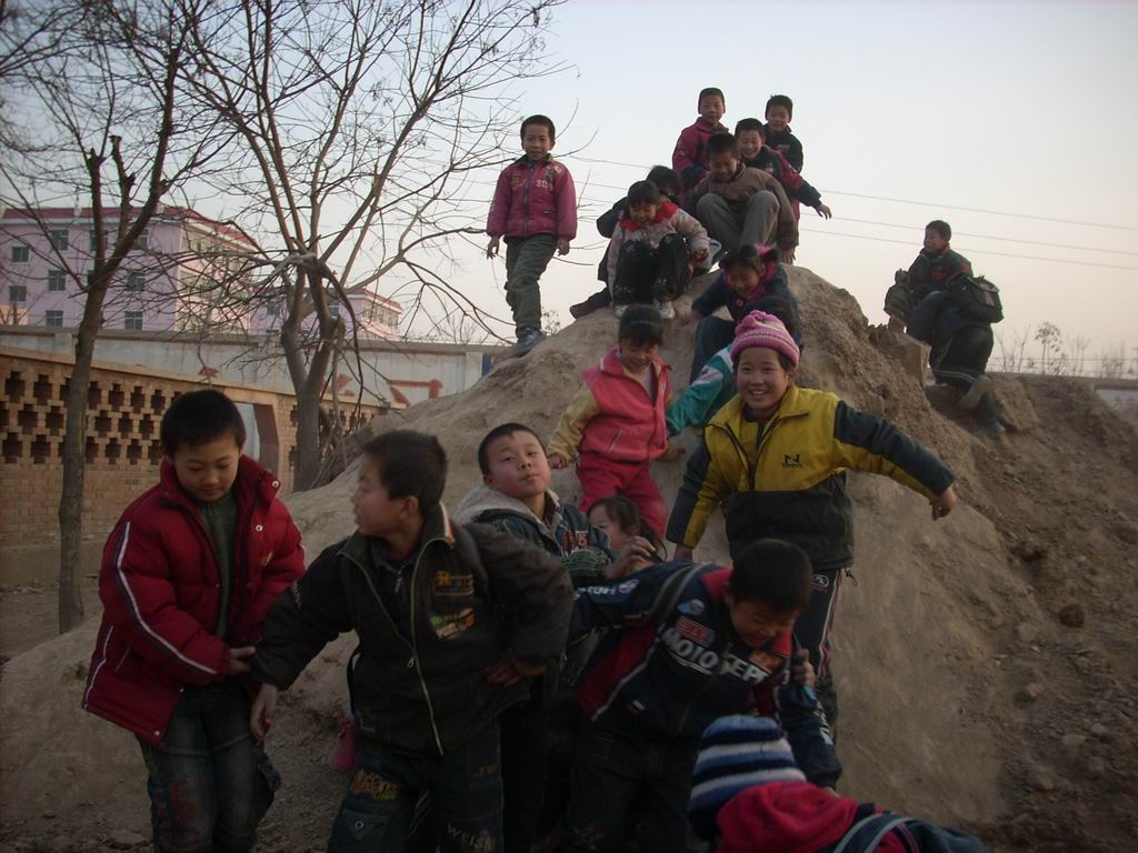 尽管没有好的体育器材,但一座小土堆仍旧可以带给他们极大的快乐。他们相互拉着从不太高的小土堆上滑下,寻找那种下滑时的刺激和快乐。