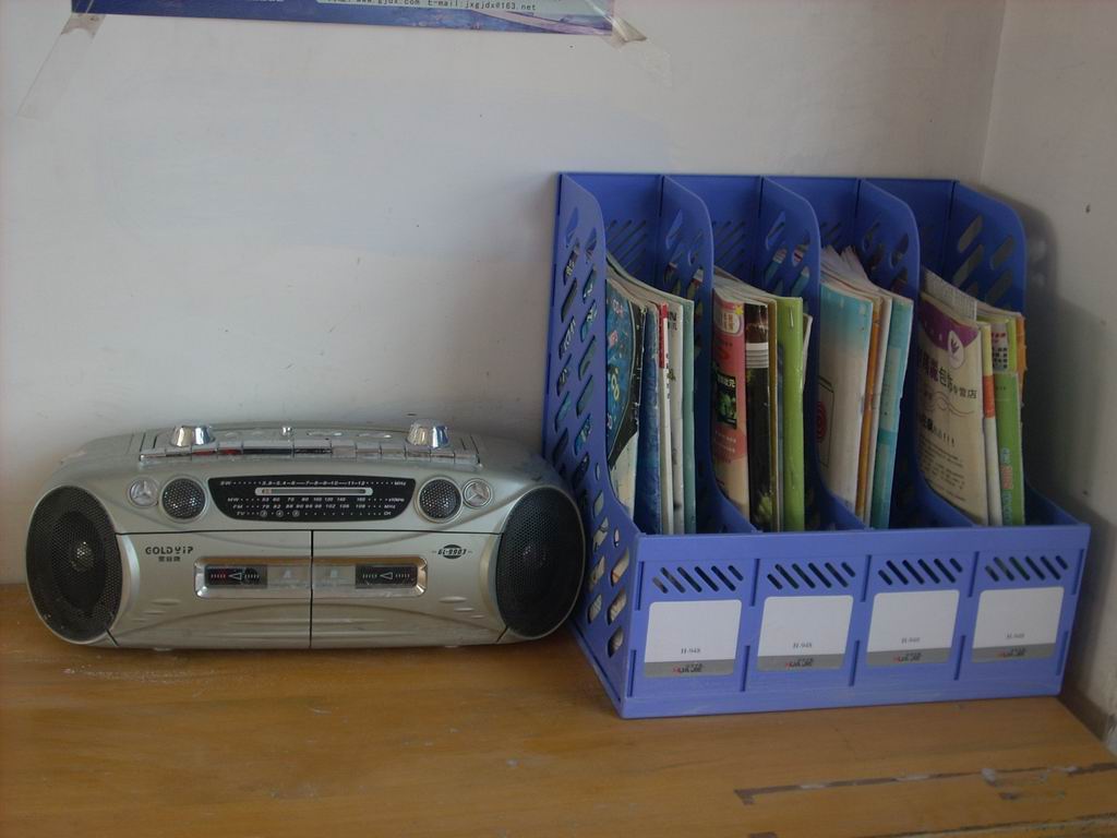 旁边的录音机也陪伴了我们很长时间了。每天清早,同学们跟着它学习英语,它为我们也做出了很大的贡献的。