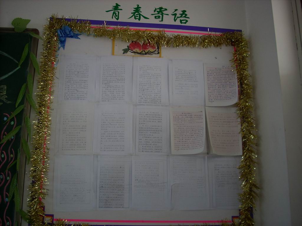 这可是我们班优秀作文的展示平台.每次老师评完作文,都会把好的作文读给大家听,然后再集中起来贴在青舂栏里,这样不仅能够吸取别人文章的精华,还能极大的激发同学们的兴趣。他们的作文不但可以让我们学习还可以让我们欣赏。青春在这里洋溢着它特有的光彩!