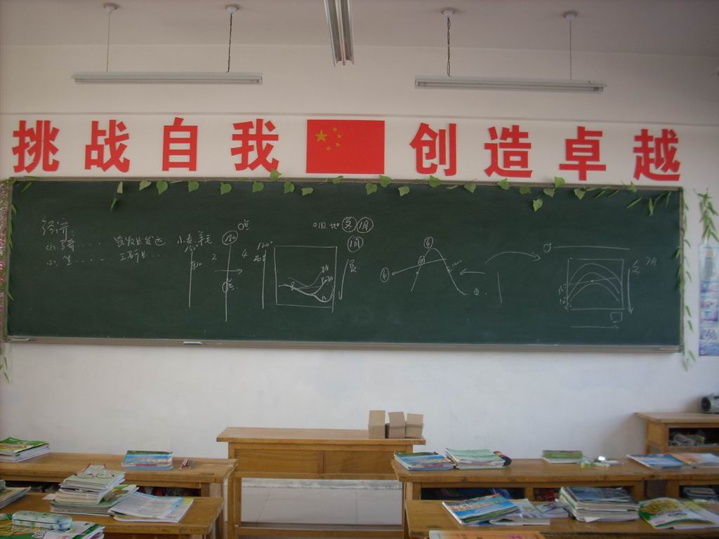 你看:"挑战自我,创造卓越"八个红色的、鲜活的大字跃然于黑板之上,这是我们班的班训。班主任常对我们说:一定要刻苦努力,总结出自己的学习方法.将自己推想顶峰,做一个真正的优秀的学生。
