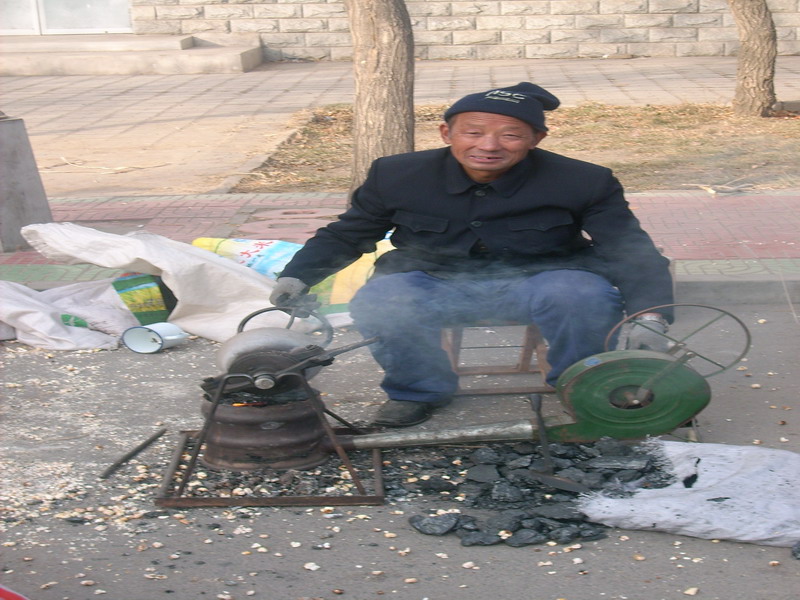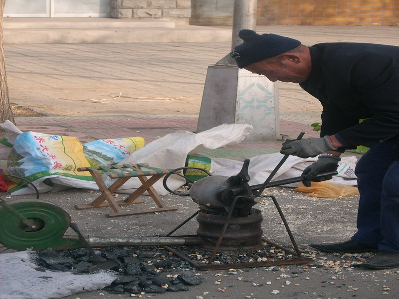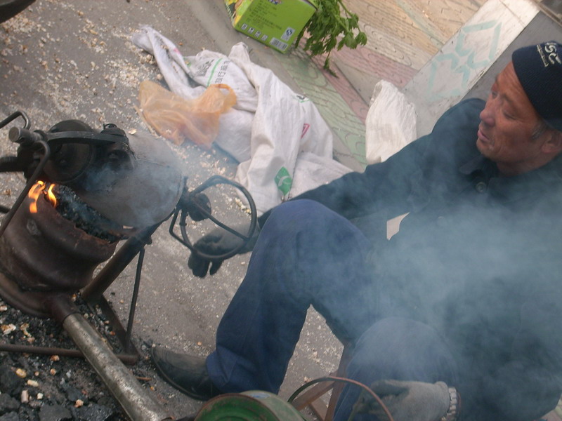 瞧!浓烟滚滚,散步在老人的周围.满地都是碳渣和溅出的残留米花.如此恶劣的环境下,爆出的米花却是那么美味.想到这里,朋友,您又作何感想呢?我当时是热泪盈眶的!