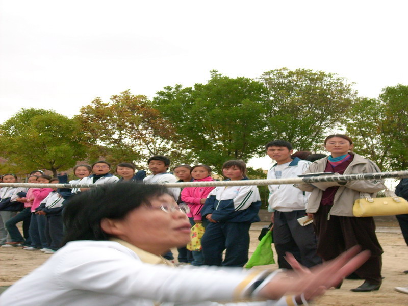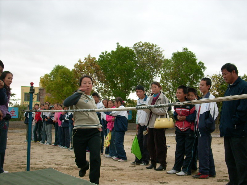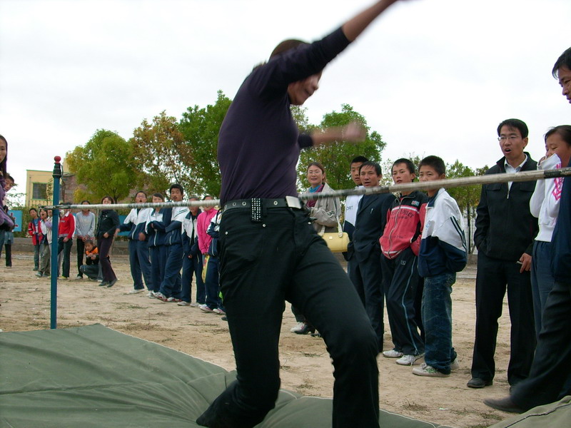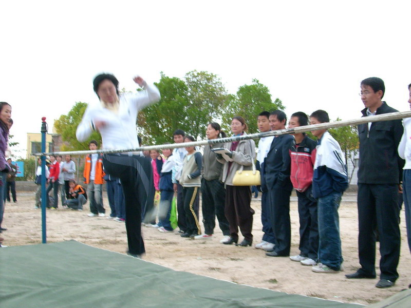 哎哟,这位老师仿佛"展翅欲飞"啊!"三步一大跨"地"飞"上了跳高竹杠,哎呀,真是"帅"呆了!