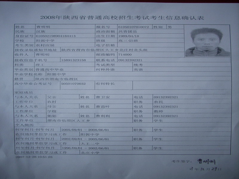 全校的采像工作持续了两天,全部结束了,老师又把所有的高考报名信息(包含照片)打印出来,让我们核对确认,并且要签字。高考报名工作进行的非常细致。从今年的网上报名来看,现在一切工作可以说都是网络化了,班主任也要在网上给我们填写评语了,有的年龄大的老师说,哎呀,我们不会电脑,不懂网络,今后我们就无法工作了。看来网络在未来社会的主要性。
