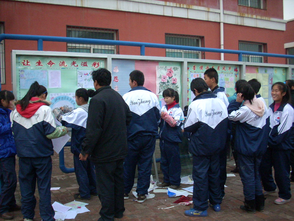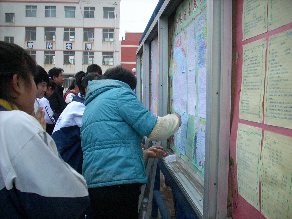 穿绿衣服的是我们的数学老师,她看我们手艺不熟练,就亲自上阵,为我班的橱窗张贴手抄板,这种师生同时参与竞技的活动在素质教育实施以前是没有的,这是我校开展素质教育的一个缩影。