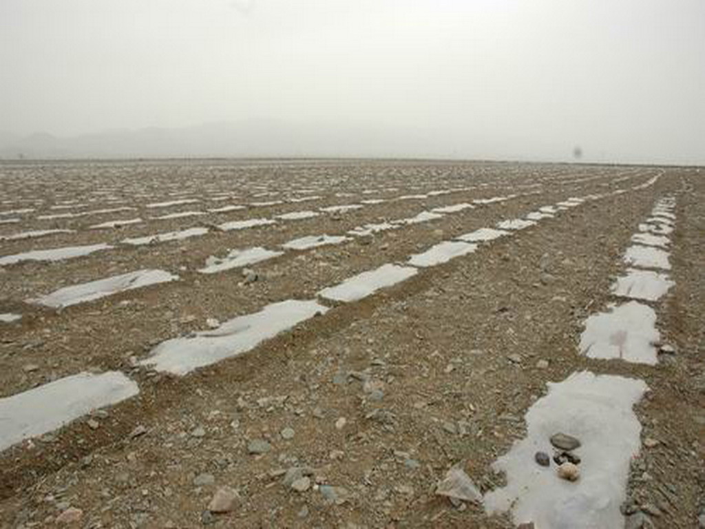 铺好砂地之后,每年的三到四月份开始就要播种种植了。为了能够使种下的种子能够顺利存活,周围的大部分村民都要在砂田里铺上地膜,这样可以保存水份和温度。看,这一望无际的地膜地多壮观呀!