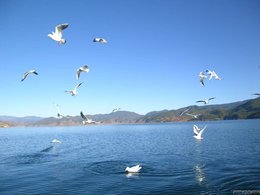 低下头我又看见成双结队的鸳鸯,它们披着深黄色的金丝绒小袄,闪着亮光,它们摆动着那婀娜多姿的步态在湖面上浸游。那高空中翱翔的白衣精灵又谁呢?哦!原来是洁白如雪海鸥。它们在觅食,它们凌空飞翔的姿态是那样的轻盈美丽。让我羡慕不已。