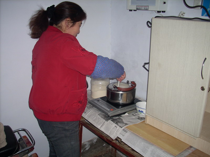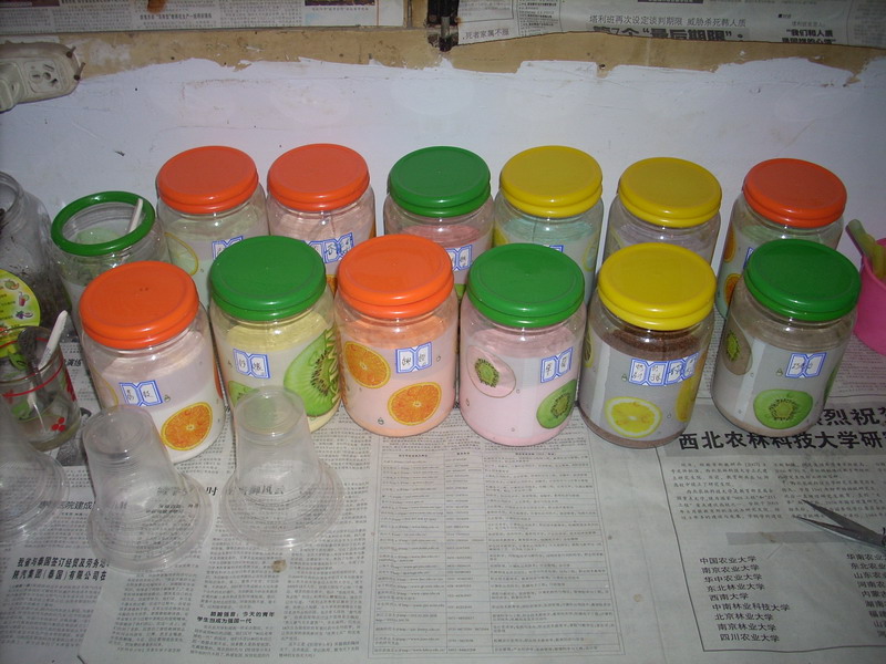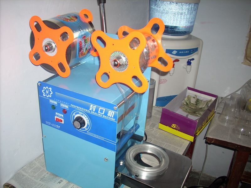 大婶将荔枝粉倒在塑料杯里,用刚才的热牛奶冲释,搅拌后,她说好了,我接过要喝,她说,别着急,还没有封口呢,我这才注意到旁边还放者一个封口机,只见她把杯子放在机器里面,用手转动摇柄,杯口就严严实实地封好了,在插进一根塑料管,然后递给我,说尝尝味道如何?