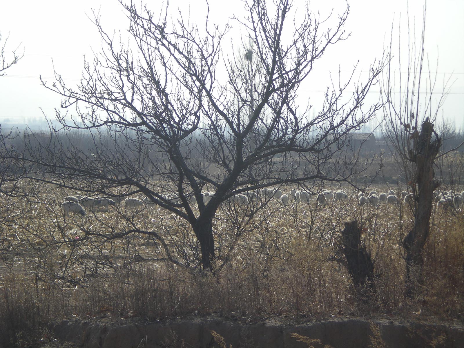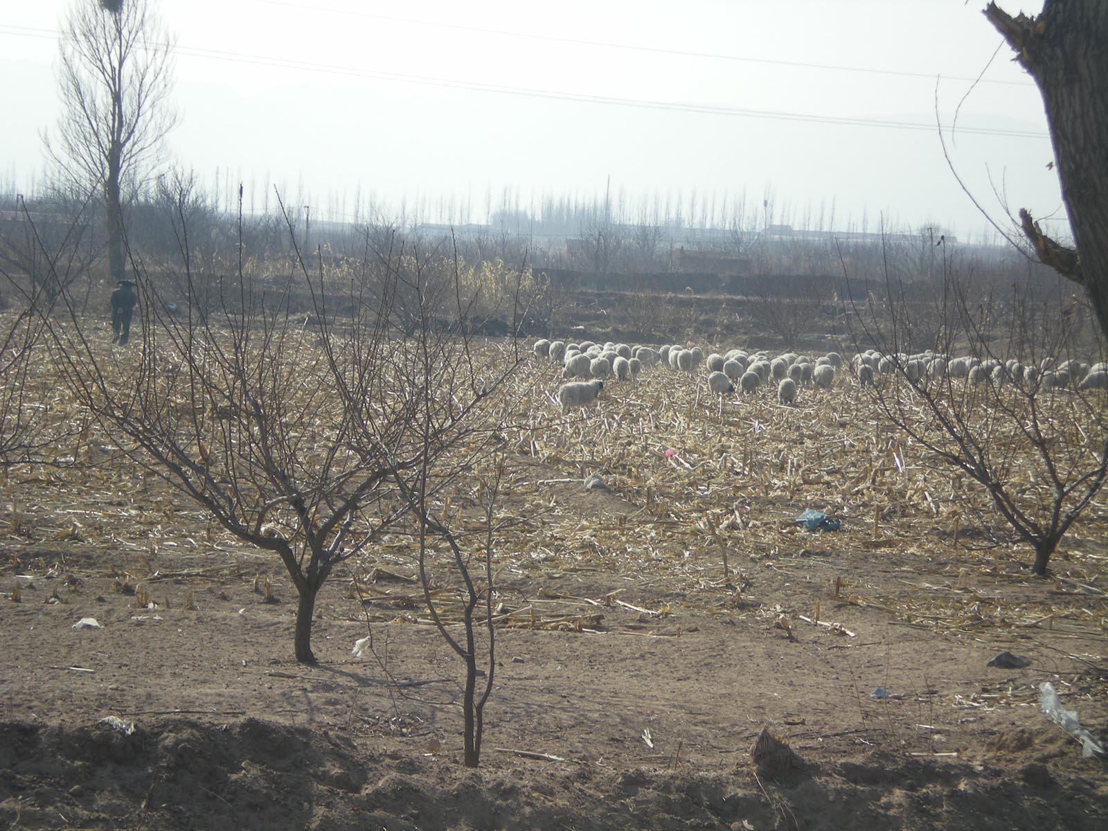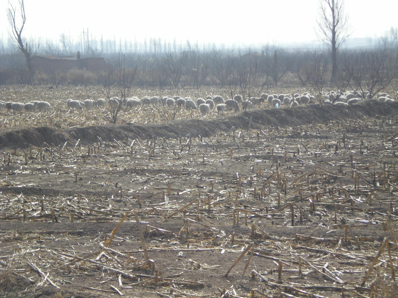 荒茫的田野飘来一片白云,在黄土地的映衬下不是特别洁白,那种移动的白给荒野增添了许多生气。那是一群羊在田野里觅食。只见它们走走停停,嘴巴不停地咬着食物,肚子圆圆的,显然已吃得很饱。田地间再没有其它动物,那些枯草败叶供它们吃足够了。