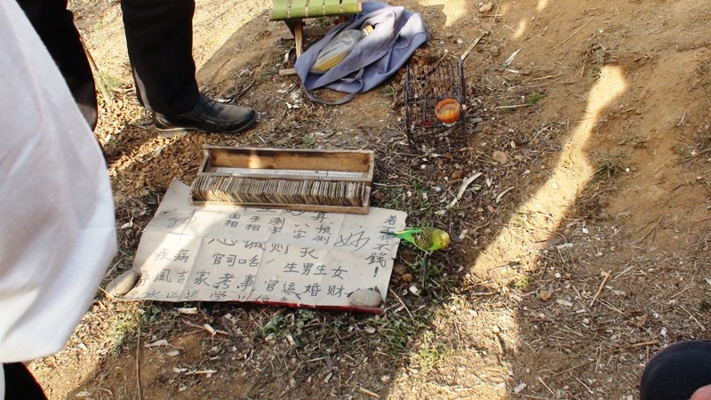 出了庙,有一个算命的小摊子。虽是迷信的东西,但却很有趣。算命的人训练了一只鹦鹉,倘若有人来算命,它可以去叼签,这引来了许多人驻足观看。
