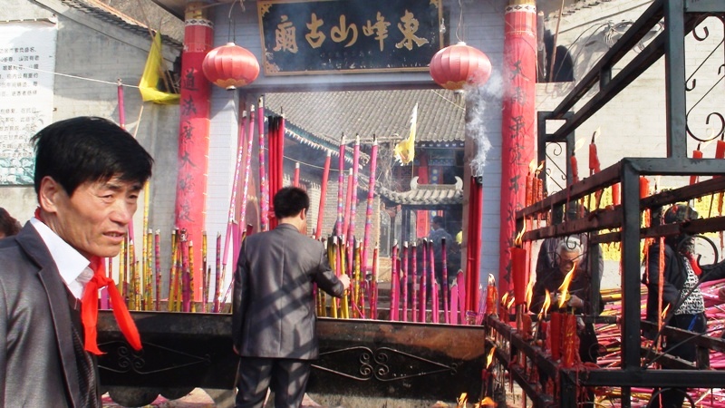 这是东峰山古庙,香火旺盛,香客整天络绎不绝。照片上的叔叔脖子上戴的很像红领巾的东西,据小姨说,是可以保佑人平安健康的。