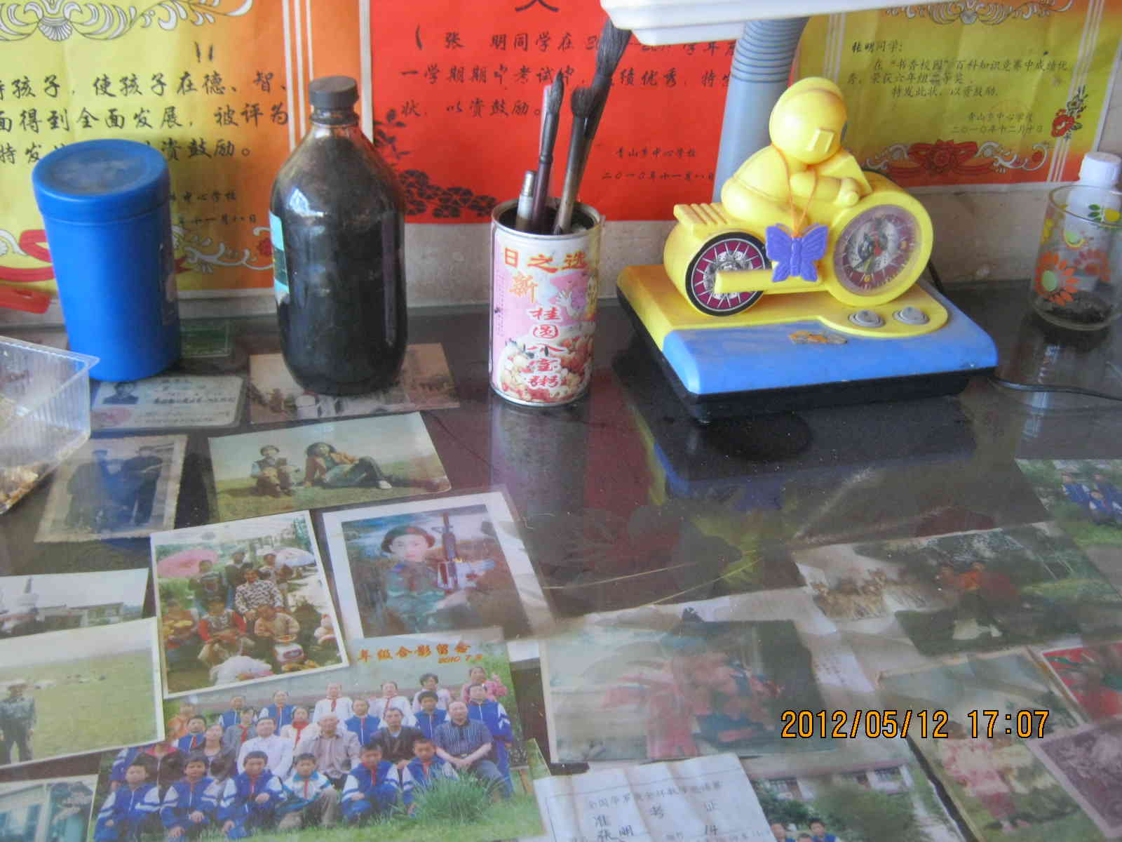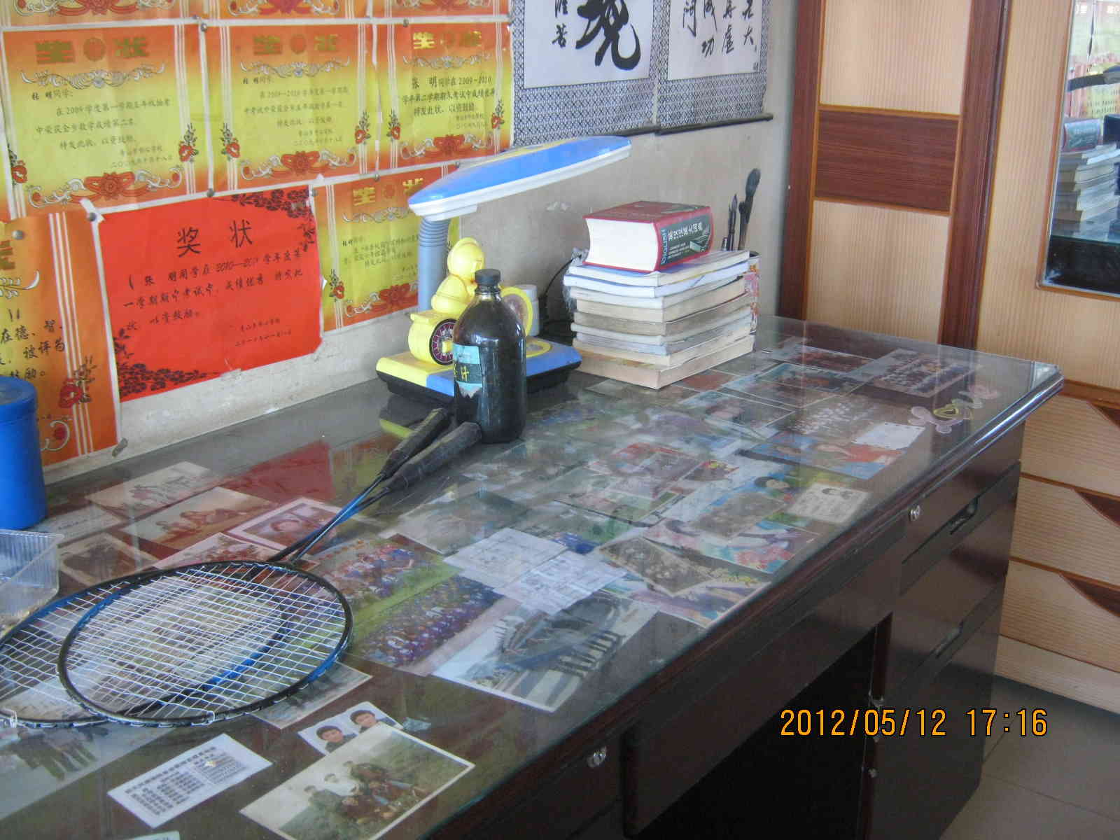 字帖的下旁是我驰骋的沙场——写字台。什么台灯、墨汁、电话……都应有尽有,尤其镶嵌在写字台下的照片们,它们好比史册记录着我家的陈年往事。当我静静的读书时,它总是用亲切的眼光看着我,而我也不时的瞅它一眼。