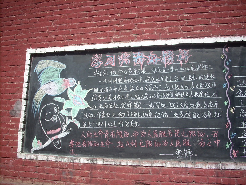 我们隔壁班的这是关于"学雷锋"的,板报内容告诉我们"雷锋"的故事。"雷锋"的伟大就在于他发扬中华民族优良传统,乐于助人的精神是我们中华儿女永远都不能忘记的优良传统,我们要继续发扬光大这种传统。
