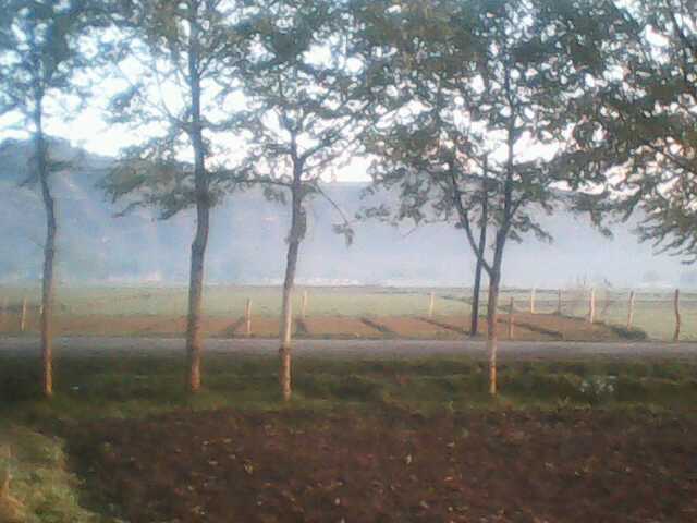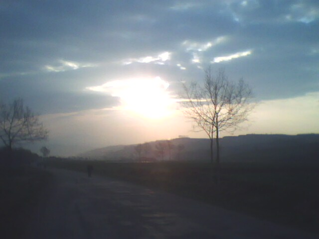 在一个地方长大早就习惯了那儿的一切,突然离开到另一个陌生的环境还真是一种情绪的挑战。我在青山环绕的地方长大,眼前总有一抹绿,可如今放眼望去四周是平平的山丘,显得苍茫,辽阔。这里总能留给人无限的想象。道路两旁平平的土地上中这个种庄稼,冬天还种着各种果树,一排排坐落的格外整齐的果树似几何图形,这不禁让我对播种人心生敬佩之情。天空似乎能与地面相切,等到夕阳西下时火红的落日与地平线的焦点就是一个切点。好一幅美丽的夕阳图!