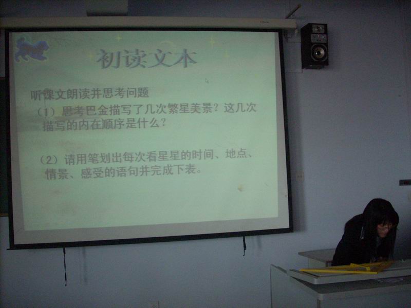 既然是研讨课,自然就少不了听课老师。一进教室向后面看去,你一定会被吓到的,黑压压一片,后面坐满了老师,有些老师还与学生坐在一起。听课老师们如同学生一样,一会儿聚精会神地听,一会儿低下头在纸上写些什么。就这样,一节45分钟的研讨课便不知不觉地上完了。