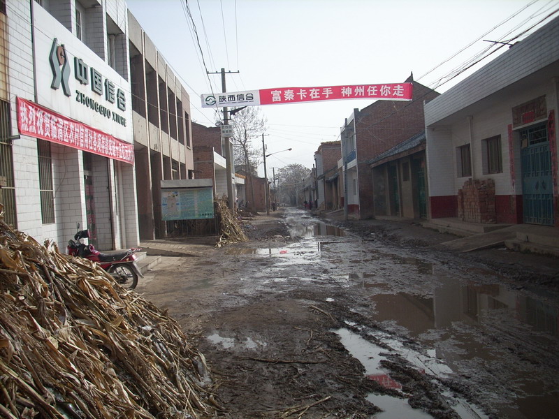 信用社门前的路更为泥泞,这里长年都积存着水,来这里不能骑车,只能走路,还必须小心翼翼.人们提起这条路,都很抱怨,希望政府能够尽快筹集资金把这条路修好.