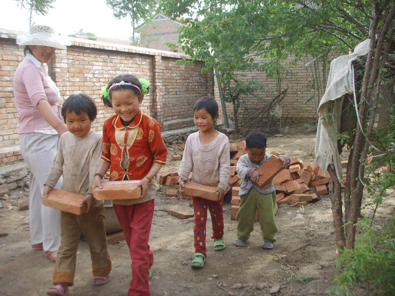 我此时非常高兴,放下书包,虽然很疲惫,但看见父亲正在修花园,我就跟两个小妹妹和几个小朋友给父亲抱砖头,一会儿工夫我们就饿了。