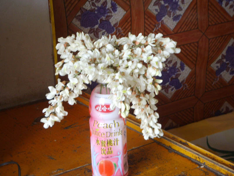 然后她把槐花插在饮料瓶里,满屋芳香醉人。