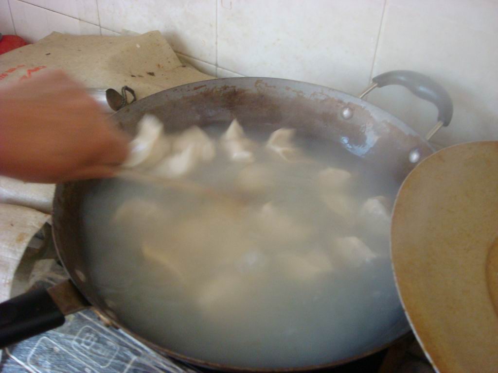 饺子包好后,妈妈开始下锅了,她把饺子放进去后,先用铲子顺了顺,说是这样可以防止饺子贴连在一起,也不会粘在锅底。她一边下饺子,一边告诉我,煮饺子也是有学问的,也得掌握技巧,有俗话说"盖锅盖煮瓤子,揭锅盖煮皮子",所以先要盖上锅盖把瓤子煮熟后再揭开锅盖煮皮子。因为我们家一般吃的都是素馅,前面要先煮了剥皮的,所以馅稍稍煮一煮就熟了,最主要的是要把皮子煮熟,只要皮子熟了就能吃了,如果煮的时间太长,就很容易破皮,味道也不好吃了。