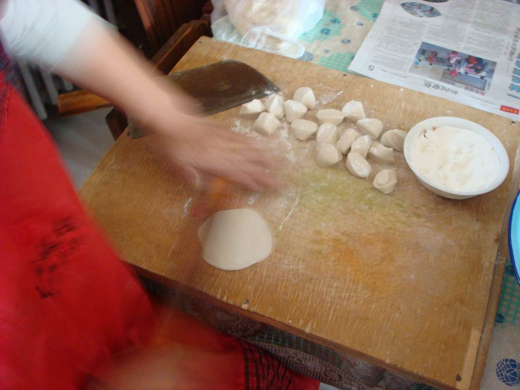 今天是12月22日,2007年的冬至,按家乡的习俗,要吃饺子,这不,家里已经准备了材料,准备包饺子了.这是妈妈在撖"张子"(这们这里叫饺子皮叫"张子"),她动作娴熟,只是用撖杖就能让张子在撖动的过程中自己旋转,几下就是一个。