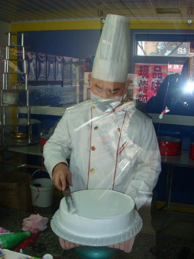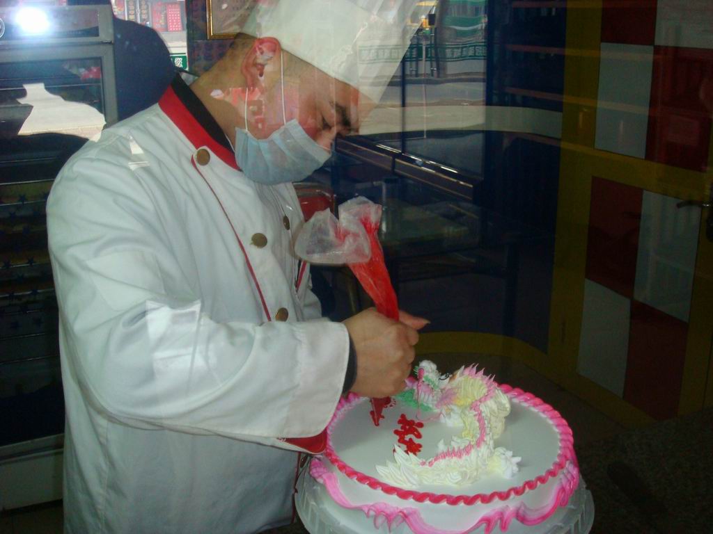 现在他正在给蛋糕做图案,看出来做的是什么了吗?