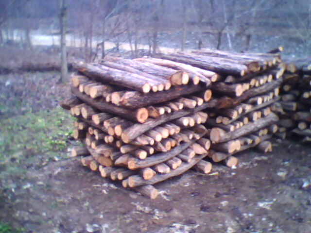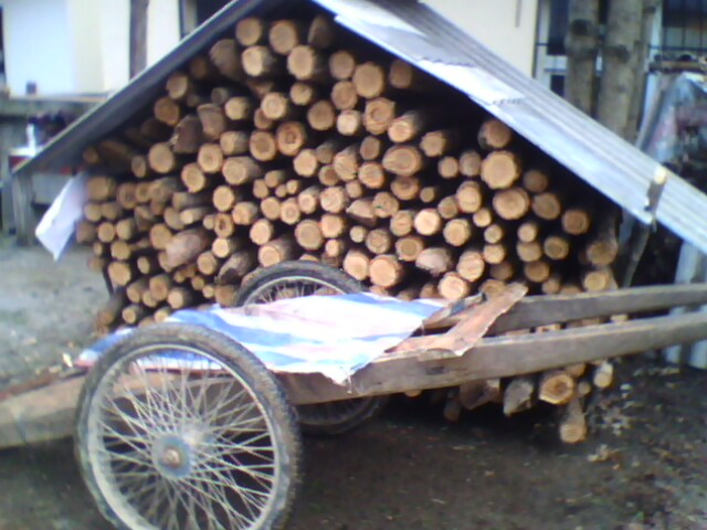 我们推着架子车来到后山坡。爸爸先上坡将木棒退推下来,再和妈妈抬起木棒放在车上。而我就负责将车把扶好,不让它左右倾斜。等到装了十几根棒后,用绳子绑紧,再慢慢推回去。放菌棒可不容易,放下的菌棒不仅要放的端正,不让它擦着车轮,而且还要保持平衡,前后重量相等不然推的时候就很费劲。