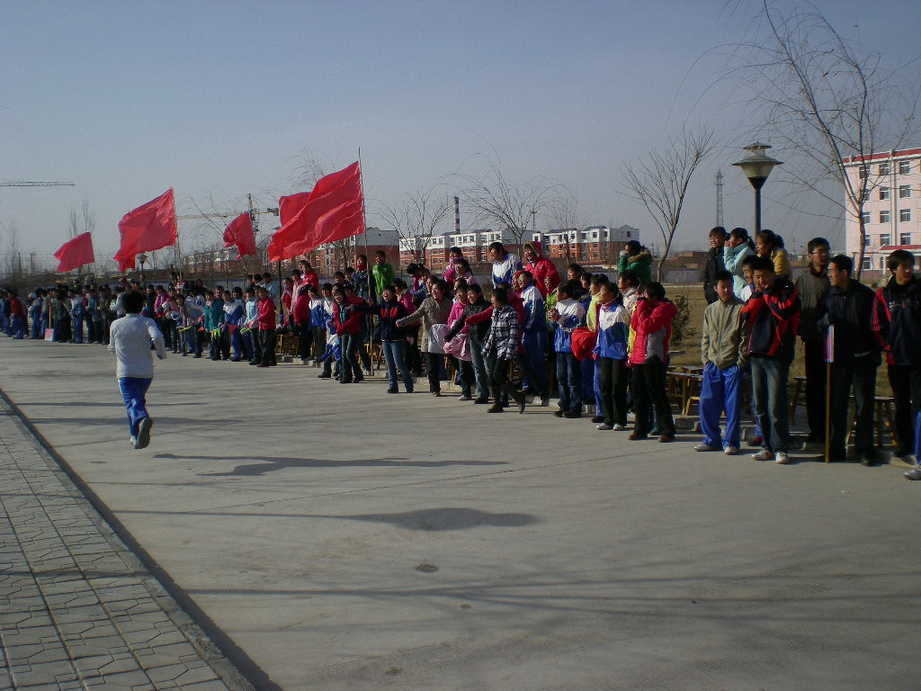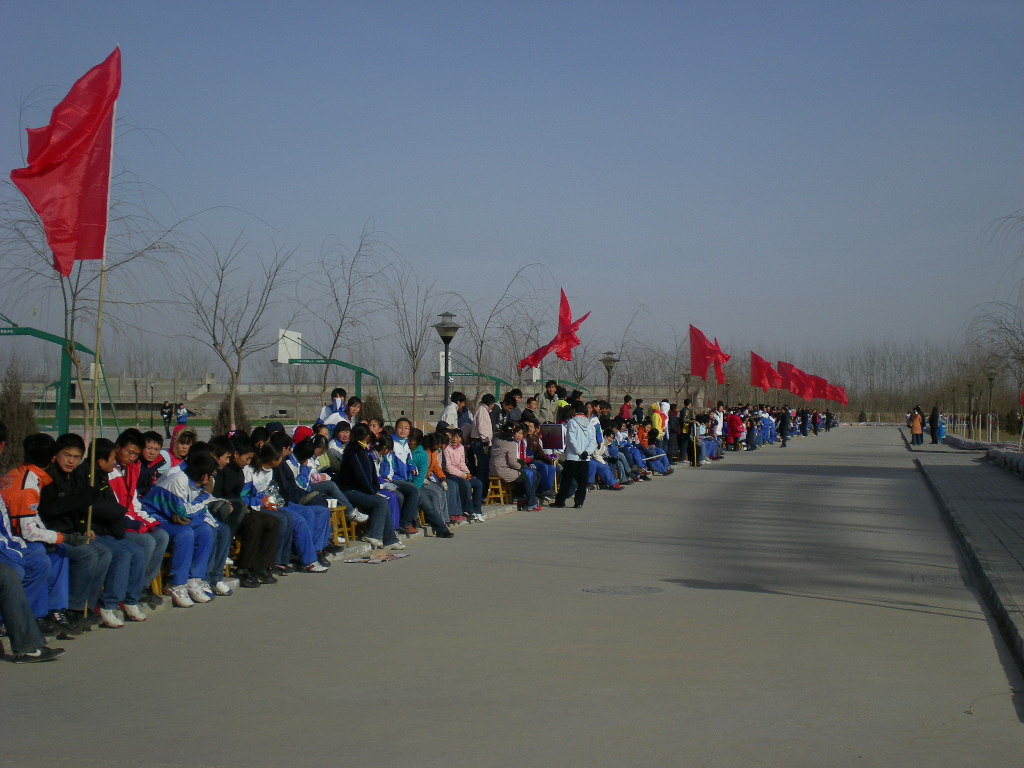 在越野赛中最少不了的就是拉拉队员了,因为他们才是真正的参与者与鼓励者。看,比赛已经开始了,各班的拉拉队员们都整整齐齐的坐在本班位置,每一班级的上空都是红旗飘飘,在运动员没来之前他们都在安静的等待着。
