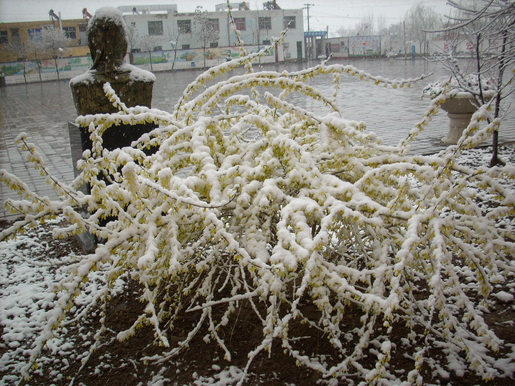 开着黄花的小树也没有逃过这场大雪带来的厄运,它被春雪包了个严严实实,由于花小,它显得十分脆弱,枝条也被大雪压弯了。